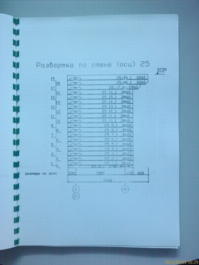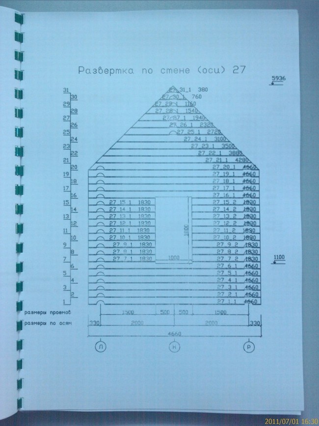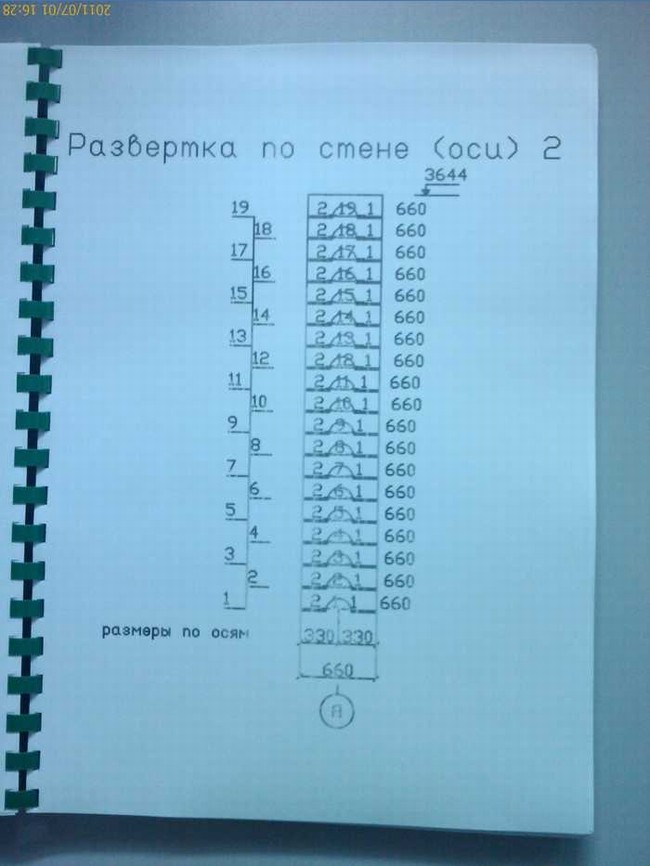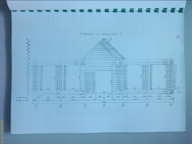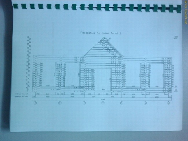 - Развертки стен по осям проекта. Наглядно демонстрируют вертикальное расположение элементов и их соединения в стенах дома.